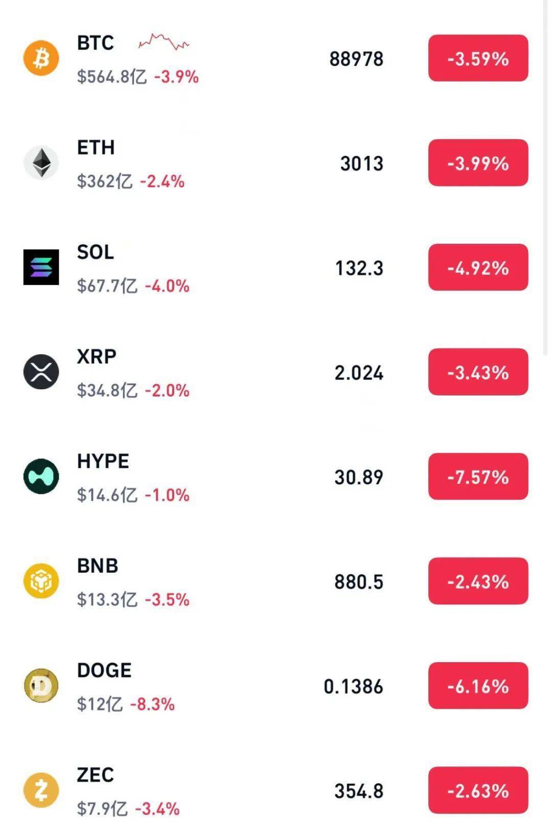 加密货币集体下落,比特币跌破89000好意思元关隘。