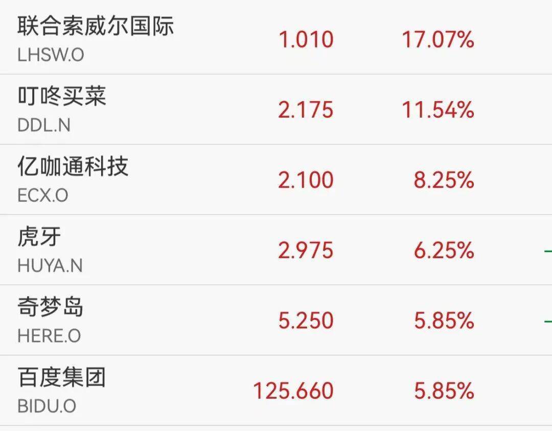 中概股宽敞飞腾,纳斯达克中国金龙指数涨1.29%,万得中概科技龙头指数涨0.66%。个股方面,叮咚买菜涨超11%,百度集团涨近6%,奇富科技涨超4%,万国数据涨超4%,信也科技涨逾4%,BOSS直聘涨超3%。
