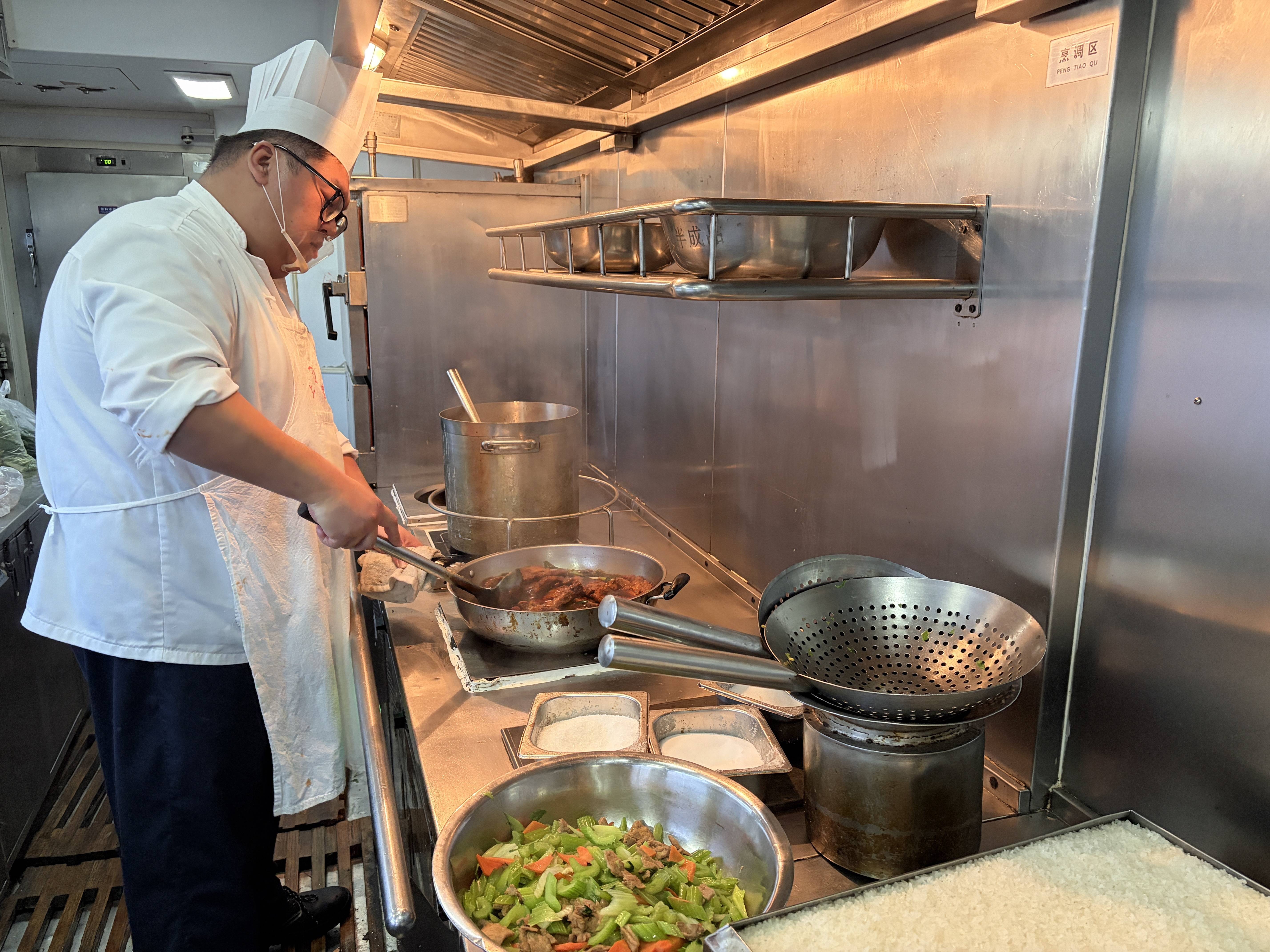 列车从上海站开出,恰是傍晚时期,餐车的后厨早已吃力起来,切好的芹菜和肉片悉数爆炒,腌制过的大排放入锅里红烩,米饭从蒸笼里取出繁荣兴旺……要是不是看窗外飞奔而过的征象,记者仿佛踏进于旅社的后厨。“餐车的座位快满了,车厢里的乘客也等着一口热饭,还有车上的共事也要分批用餐,咱们得合手紧干。”厨师李睿晟说。