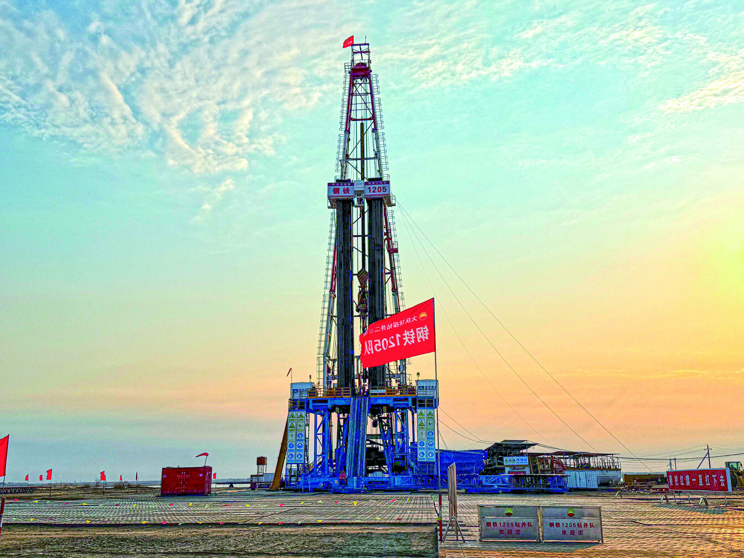 1205钻井队的井架高高站立。新华逐日电讯记者孙晓宇摄钻塔上红旗猎猎,钻塔下提问铿锵。