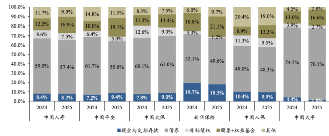商场最为柔软的是,较2024年,上市险企职权钞票仓位多半昭着提拔。从钞票建立结构看,上市险企的债券投资范围仍在增长,同期多半大幅增配股票和职权基金。